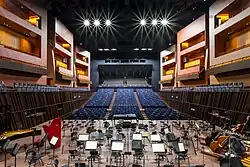 Designed on the concept of a "shoebox", the Grand Auditorium has a volume of almost 20,000 m3 and seats up to 1,500 listeners. To overcome the constraints of a rectangular room and to optimize the acoustics, eight towers of boxes are located around the stalls in an irregular fashion and contribute to uniform sound distribution. Like in Shakespearian theatre, the public is involved in the show with a stage visible from all sides and a choir area that can be adapted into additional seating.