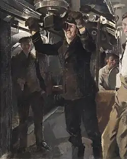 Although he was nearly 40 years old when the First World War broke out, Connard volunteered as a private, learned to ride, and fought in France as a member of a gun team in the Royal Field Artillery. He reached the rank of Captain before being invalided out because of severe shell shock. He was later appointed an official war artist to the Royal Navy and painted the surrender of the German ship SMS Goeben and the Zeebrugge raid.[2] This work for the Navy is in the Imperial War Museum in London.