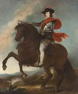 Philip IV (Spanish: Felipe Domingo Victor de la Cruz de Austria y Austria,[1] Portuguese: Filipe III; 8 April 1605 – 17 September 1665), also called the Planet King (Spanish: Rey Planeta), was King of Spain from 1621 to his death and (as Philip III) King of Portugal from 1621 to 1640. Philip is remembered for his patronage of the arts, including such artists as Diego Velázquez, and his rule over Spain during the Thirty Years' War.