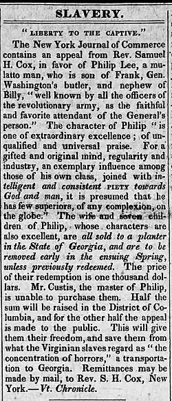 In 1829, Nelly's owner decided to sell her and the children to Georgia, but "Philip set out on a campaign to raise $1,000 to purchase them."[5] Custis allowed him to do this and seems to have participated in the publicity, suggesting that Philip Lee was what has been called a "key slave," who was especially trusted by his enslaver and granted an unusual degree of both responsibility and freedom.[10] Philip Lee himself is quoted as saying, "If you can procure the sum of $500 in New-York, you may, and I desire that you would, take them all to the north, and own them and make them serve in payment as long as your laws will allow. My wife shall bind herself there to any kind master there as long as he pleases, and my children also shall be bound; and if I never see them again in this world, I shall be happy: but how can I bear to have them sent to Georgia?"[1][a]