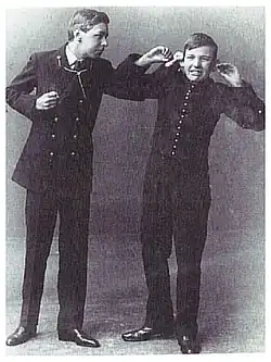 In September 1908 Tonge was cast as Freddy in The Sway Boat at the Kingsway Theatre, London,[1] and in December of the same year he had the important role of Tommy in Tree's Christmas family play, Pinkie and the Fairies. The cast was headed by Ellen Terry, and included Frederick Volpe, Marie Löhr, Viola Tree and the young Hermione Gingold.[3] The following year he was in A Boy's Proposal, a curtain-raiser for Galsworthy's Strife at the Adelphi. The reviewer in The Times called Tonge "a remarkable boy" and commented, "Nothing more natural and more accompllshed than this youngster in an Eton jacket could be imagined, and the piece is well worth seeing for his amusing performance alone."[4] In 1911 Tonge and Mary Glynne had the principal children's roles in a comic opera, The Love Mills at the Globe.[5]