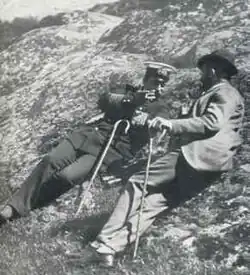 Count Eulenburg was invited to accompany Prince Wilhelm of Prussia on a hunting trip on 19 April 1886. Wilhelm was the eldest son of Germany's Crown Prince Friedrich, and the future Kaiser Wilhelm II. This meeting changed Eulenberg's life. Eulenburg soon became best friends with the prince (who was twelve years his junior), and they remained so for the next 22 years.[5] After meeting him, Eulenburg declared his "boundless love" for the prince.[18] A friendship developed between the two, in which the count, with his worldly wisdom, was to offer the young, impetuous and nervous prince both emotional support and intellectual distraction. Eulenburg also offered him the spiritual warmth that the prince hadn't found with his parents or at the Prussian royal court. During this period, Eulenburg started to share his love of the occult with his new best friend. In August 1887, Eulenburg wrote to Prince Wilhelm about a séance he had recently organized, that "I was overjoyed that we find ourselves in agreement in this area as well, and it has shown me clearly yet again how very lucky I have been to meet Your Royal Highness! To be understood in all things so well, that is true happiness!"[19] In the same letter, Eulenburg warned Wilhelm never to speak in public about their shared interest in the occult as most people would not understand it.[20]