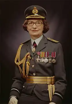 She was promoted to squadron officer (equivalent to squadron leader) on 1 July 1953,[4] to wing officer (equivalent to wing commander) on 1 January 1964,[5] and to group officer (equivalent to group captain) on 1 July 1966.[6] From 1968 to 1969, she served as commanding admin officer at RAF Strike Command.[1] In 1969, she was appointed director of the Women's Royal Air Force in succession to Dame Felicity Hill.[1] On 1 July 1969, she was promoted to air commodore, becoming the most senior ranking woman in the Royal Air Force.[7] She stepped down as director in July 1973 to be succeeded by Molly Allott,[8] and retired on 1 September 1973.[9]