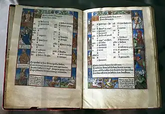 Influenced by German and Italian decorations, the book of hours was known for historical reasons with illustrations and prints based on calligraphy used by scribes of the fifteenth century. Pigouchet is known for illustrating one of the most remarkable prints for the book of hours that contained twenty-three large cuts and each of its 144 pages is surrounded by smaller borders filled with charming detailed ornaments.[6] Philippe Pigouchet and Simon Vostre assembled the book of hours for Cambrai and Besançon. Similar work by Antoine Vérard in Paris during 1508 was produced and printed for Chartres. Antoine was well known for being a part of a creative movement of biblical books.[7] Verard issued the first printed Book of Hours and the first to create the book a work of art. Dupre, who worked for Verard considered Pigouchet his formidable rival because of the beautifully printed works of the book of hours.[8] Such cradle-editions like the Horae was not printed for everyone. They were printed for collector's care of the wealthy. Gutenberg and Sweynheym, Aldus and D'Alopa, Vostre and Pigouchet and Caxton and De Worde were considered to be the greatest men in printing of the fifteenth century. The Book of Hours were printed on vellum or illustrated with color by hand and illuminated in gold and silver in the fashion of the more expensive manuscript.[1]