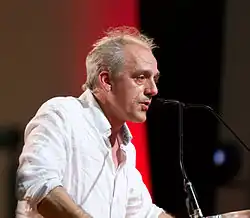 Poutou supported and took part in the yellow vests movement that started in 2018, within the larger protests against Emmanuel Macron, stating it was "the expression of a fed up with a society that is deeply unjust".[25] On 28 June 2020, he took office as a municipal councillor and metropolitan councillor of Bordeaux, following the 2020 municipal election, in which he campaigned most notably for free public transportation. Previous attempts to win a seat in the municipal council as lead candidate in 2001 and 2014 were unsuccessful.