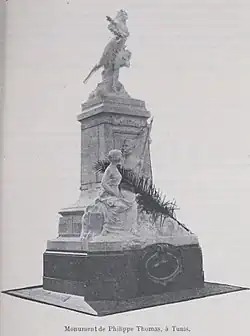 On 10 December 1908, the Bey Muhammad an-Nasir gave Philippe Thomas's name to the Metlaoui station in recognition of the prosperity that his discovery of phosphates of lime had brought to the country.[11] A medallion was placed in front of the station.[14] A monument with a bust of Thomas by the sculptor André César Vermare was inaugurated in Sfax by Gabriel Alapetite, Resident-General of France in Tunisia on 26 April 1913.[16][17] Alapetite inaugurated another monument in honour of Thomas in Tunis on 29 May 1913.[14] Thomas's bust in Sfax and that of the olive-grower Paul Anthelme Bourde were thrown down and shattered on the night of 3–4 January 1957. The monument in Tunis was toppled soon after.[18] The fragments of the bust were recovered and sent to France, where they are held in the Philippe Thomas room in the Compiègne school of the Army Biological and Veterinary Service.[19]