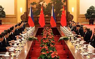 Diplomatic relations between the People's Republic of China and the Philippines were established in June 1975. Relations peaked during the Philippine presidencies of Gloria Macapagal Arroyo and Rodrigo Duterte. However, they have deteriorated due to territorial disputes in the South China Sea, particularly since the 2012 Scarborough Shoal standoff; in 2013, the Philippine government under President Benigno Aquino III in 2013 filed an arbitration case against China over China's maritime claims. The policy of current Philippine president Bongbong Marcos aims for distancing relations between the Philippines and China in favor of the country's relationship with the United States. The current policy of the general secretary of the Chinese Communist Party aims for greater influence over the Philippines, and the region in general, while combating American influence.