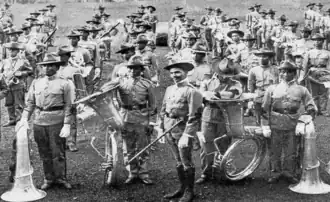 The Philippine Constabulary Band was formed on the orders of Colonel Henry Allen, the first chief of the Philippine Constabulary.[2] Walter Loving, a former United States Army regimental band leader who had been educated at the New England Conservatory of Music, successfully applied for the directorship of the new organization which saw its first public performance in late 1902 at the Manila Elks Club.[2] The band's first members were recruited by Loving from community ensembles that performed in the small towns of Luzon, some of whom were former musicians in Spanish Army bands.[2][3] Auditions for the ensemble were fierce; 300 clarinetists, for instance, tried out for just eight billets.[2]