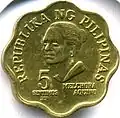 A second eight-pointed scallop edge coin featuring Aquino was minted from 1975 to 1983. The name of the Republic was moved to the obverse, and Aquino now faced the left. On the reverse read the inscription 'Ang Bagong Lipunan'. The issues from 1979 to 1982 featured a mintmark underneath the five centavo.