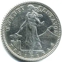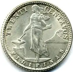 During the American period in the country, the twenty-centavo coin was reintroduced in 1903. It contained 90% silver and 10% copper, weighed 5.3849 grams, and had a diameter of 23 millimeters.[3] In 1908, the coin was reduced to a diameter of 20.86 millimeters, and the silver content of that coin was 75%.[4] During the time of the Commonwealth of the Philippines, the symbol on the reverse side of the coin was changed in 1937, and production of the coin ended during 1945.[5] Since then, the coin has not been produced until there are plans to reintroduce the twenty-centavo coin by the Bangko Sentral ng Pilipinas.