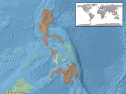 Dryophiops philippina is endemic to the Philippines, where it is found in the islands of Luzon (including Bataan), Mindoro, Sibuyan, Panay and eastern Mindanao (Diuata Range). On Panay it has been recorded within primary and secondary lowland tropical moist forests, and in areas nearby. This species might need forest cover for refuge.[1]
