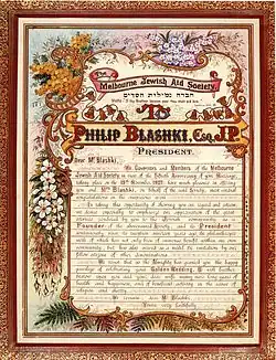 Blashki was a foundation member and a term vice-president of the Victorian Employer's Federation,[14] co-founded the Jewish Herald Association and was on the board of the Benevolent Asylum and the Montefiore Homes.