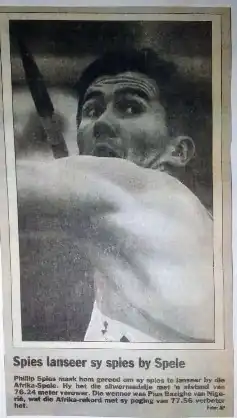 Philip Spies (born 21 May 1970) is a retired South African javelin thrower. Primarily a provincial cricketer at school and South African Country District level, chose athletics over cricket. The arrival in South Africa of the USA's World Record Holder, Tom Petranoff (in 1989) was a big deciding factor for Spies with regards to choosing athletics over cricket. Petranoff became an integral part of Spies' athletics career and still regards Petranoff as being one of the great javelin throwers of all time: 99.72 meters old model and 85.38 meters new model.