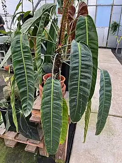 Philodendron patriciae is a plant in the genus Philodendron native to the Chocó region of Colombia. It was scientifically described in 2010 by Thomas Croat,[1] who named it after his wife Patricia and called it "one of the most spectacular species of Philodendron that he had ever seen".[2] An hemi-epiphyte, as it climbs the long, ovate-lanceolate leaves hang down and develop ruffles. The ovules of the plant are set up axially and number up to at least 10 per locule. It is also characterized by its short stems and pendent narrow blades, which are matte and become undulated in age.[2]