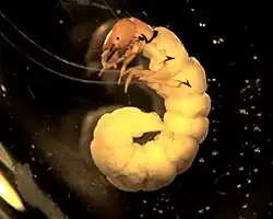 The aquatic larvae of these caddisflies spin mesh nets of silk in flowing water to catch food. A larva can spin over a kilometer of extremely thin silk to create its intricate net.[3]