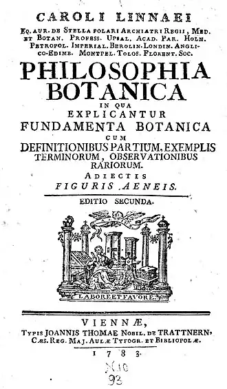 - Linnaeus, Carl (1755) [1751]. Philosophia botanica: in qua explicantur fundamenta botanica cum definitionibus partium, exemplis terminorum, observationibus rariorum, adiectis figuris aeneis. originally published simultaneously by R. Kiesewetter (Stockholm) and Z. Chatelain (Amsterdam). Vienna: Joannis Thomae Trattner. Retrieved 13 December 2015.
