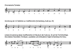 The composition is constructed based a “row”, or basic sequence of the twelve tones, with the general rule that all twelve tones must be used before individual tones can be repeated (see image for example of row used in Schoenberg's Suite for Piano, op. 25). The basic row can be followed by a reversal or retrograde form of the initial row, or alternatively derivations of the row, and compositions may also utilize two or more rows.