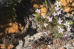 Philotheca pinoides is a species of flowering plant in the family Rutaceae and is endemic to the south-west of Western Australia. It is a small, erect undershrub with needle-shaped, glandular-warty leaves and pale pink or red flowers arranged singly or in groups of up to three in the axil of leaves at the end of branchlets.