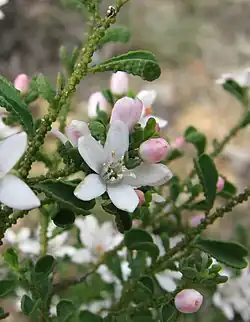 Philotheca verrucosa, commonly known as fairy wax-flower or Bendigo wax-flower,[2] is a species of flowering plant in the family Rutaceae and is endemic to south-eastern Australia. It is a small shrub with prominently glandular-warty branchlets, heart-shaped or egg-shaped leaves with the narrower end towards the base, and white flowers usually arranged singly in leaf axils.