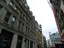 It is the site of London's smallest public statue, The Two Mice Eating Cheese, on a building near the junction with Eastcheap. The sculpture supposedly commemorates the death of two workmen, who are said to have fallen from scaffolding either during the construction of the building in 1862,[2] or during the construction of the nearby Monument to the Great Fire of London in the 1670s.[3] Some versions of the story have both of them dying,[2] others say that one pushed the other from the roof.[4] The story goes that the workmen were arguing over the theft of a sandwich, which was later revealed to have been taken by mice.[2]