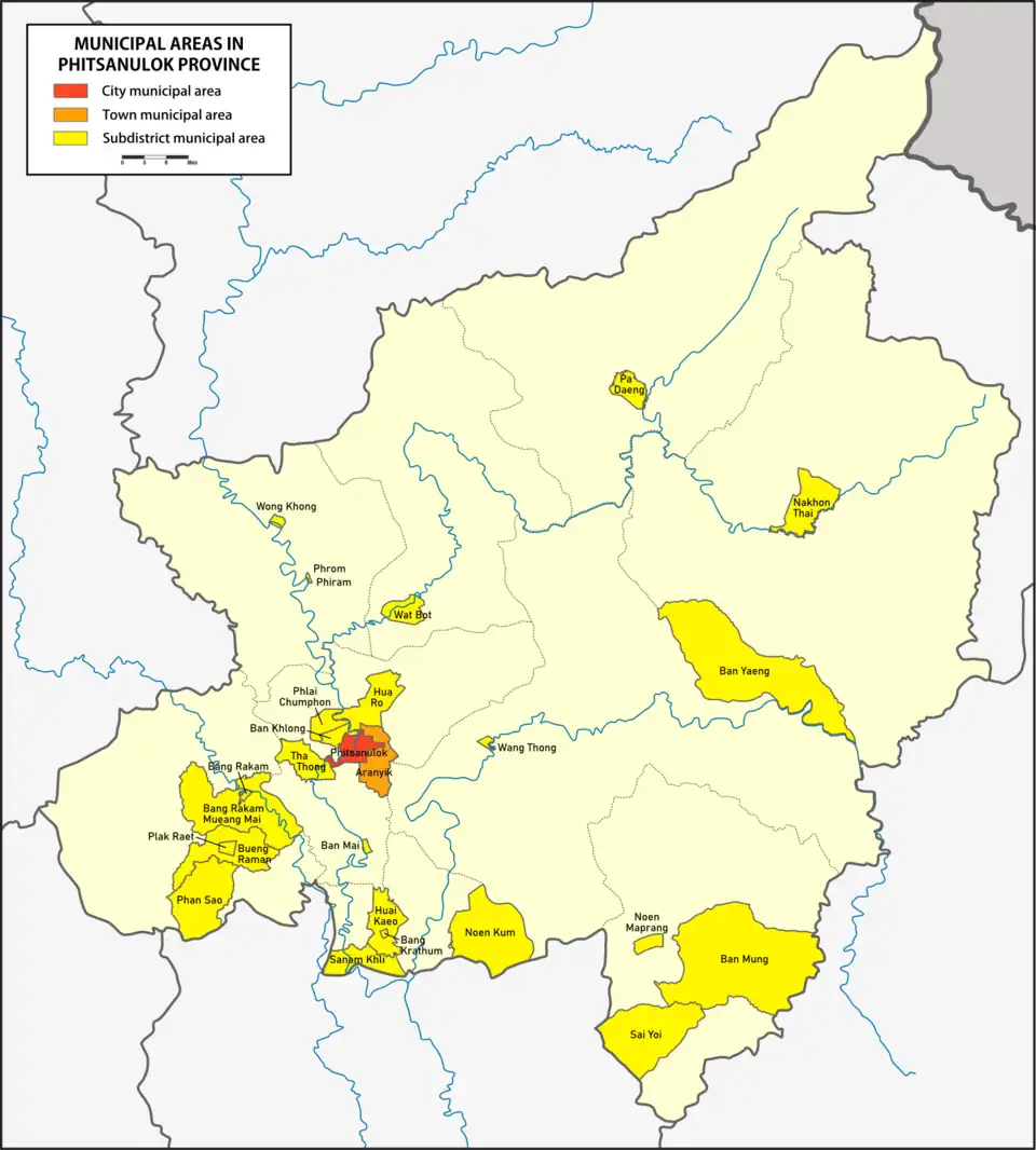 ^ abPhitsanulok Provincial Statistical Report 2562-2019. Phitsanulok Provincial Statistical Office (Report). National Statistical Office (NSO). 2020. pp. 6–7. ISSN1905-8314, the following municipalities are missing from the report: Hua Ro (30-09-2011), Tha Thong (24-08-2012), Ban Khlong (24-08-2012), Bang Rakam Mueang Mai (30-09-2011) and Huai Kaeo.{{cite report}}: CS1 maint: postscript (link)