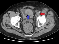 Phlegmasia cerulea dolens (PCD) (literally: 'painful blue inflammation'), not to be confused with preceding phlegmasia alba dolens, is an uncommon severe form of lower extremity deep venous thrombosis (DVT) that obstructs blood outflow from a vein. Upper extremity PCD is less common, occurring in under 10% of all cases.[1] PCD results from extensive thrombotic occlusion (blockage by a thrombus) of extremity veins, most commonly an iliofemoral DVT, of the iliac vein and/or common femoral vein.[2][3] It is a medical emergency requiring immediate evaluation and treatment.