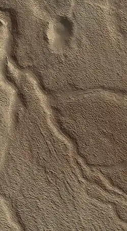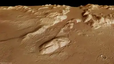 Valleys cross-cut the Phlegra ranges and are occasionally occupied to some degree by lineated valley fills. These landforms are intricately patterned texturations that appears to demonstrate erosive characteristics in the upland, depositional characteristics in the lowlands, and indicators of directional flow between the two. In some valleys, lineated valley fills have been found to descend both the east and west foothills of the Phlegra mountain range system.[2] These fills are sometimes banded by hummocky pits (interpreted as recessional moraines) and display regions where flow patterns appear turbulently disrupted or appear to have been backfilled by material associated with the flow. Pitted surfaces abound and—in addition to the disrupted surfaces—are typically associated with the degradation of a glacial surface near the glacier's terminus.