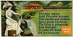 To promote this, the Calkins advertising department created, "Phoebe Snow", described as "a young New York socialite, and a frequent passenger of the Lackawanna."[1][2] The advertising campaign presented Miss Snow as often traveling to Buffalo, New York, and always wearing a white dress.[3]: 9 Calkins said he based the campaign on an earlier series of Lackawanna car cards (advertisements displayed inside coaches) - All in Lawn - created by DL&W advertising manager, Wendell P. Colton. They had been built on a rather limiting nursery rhyme, The House That Jack Built, and featured a nameless heroine dressed in white. For his new campaign, Calkins adopted a form of verse inspired by an onomatopoetic rhyme, Riding on the Rail, that he felt offered endless possibilities.