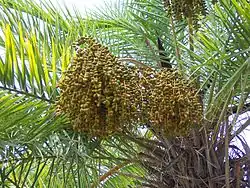 The plants are unisexual and florets appear at the top of the palm stem. Male florets are a dirty, pale yellow and fall off after blooming; females are small, globose and yellow-green.[4] This species grows edible, oblong fruit, orange in color (when ripe), at 2.5 cm in diameter. The fruit are borne in large, pendant clusters and contain one seed each.[4]