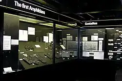 The Toftshaw skeleton preserves a disarticulated skull (missing much of the snout and skull table), most of the right forelimb and shoulder, fragments of the left forelimb, a few vertebrae, ribs, and numerous scales. It is split across 25 smaller pieces in three large chunks, each coated with scales and Lepidodendron bark. Watson (1929) suggested that the animal died while sheltering in a Lepidodendron trunk, with the rear part of the body eaten by fish and other scavengers.[9] Clack (1987), on the other hand, argued that the animal died in a river, with decay and a constant current carrying away most of its body before the front half was covered by mud and a fallen tree.[1] Most of the skeleton (specimen NS 111.81) now resides at the Cliffe Castle Museum in Keighley. In 1875, a few pieces of the holotype were purchased by the Museum of Comparative Zoology in Cambridge, Massachusetts. The Natural History Museum in London acted in a similar fashion in 1895. Beyond the holotype, all three museums have acquired various isolated fragments from Toftshaw and the nearby Low Moor industrial site.[1] A partial Pholiderpeton skull from Swanwick, Derbyshire (specimen A2) is housed at King's College London.[11][3][1]