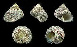 The height of the shell varies between 15 mm and 28 mm, its diameter between 21 mm and 24 mm. The shell is imperforate in the adult, generally perforate when immature. It is heavy and thick and has an elongate-conical shape. Its color is cinereous greenish or whitish, spirally traversed by bands composed of alternating white and black purplish or red squarish spots. The intervals between the bands are longitudinally closely lineolate with blackish. The spire is elevated. The shell contains about 6 whorls. The upper ones are slightly convex, the last generally constricted and concave below the suture, then convex. The spiral impressed grooves or lines are like those of Phorcus turbinatus in the young, but become generally obsolete in adult specimens. The aperture has the same shape as in Phorcus turbinatus, but is smaller and less oblique.[3]