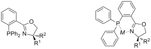 Phosphinooxazolines (often abbreviated PHOX) are a class of chiral ligands used in asymmetric catalysis. Colorless solids, PHOX ligands feature a tertiary phosphine group, often diphenyl, and an oxazoline ligand in the ortho position. The oxazoline, which carries the stereogenic center, coordinates through nitrogen, the result being that PHOX ligands are P,N-chelating ligands. Most phosphine ligands used in asymmetric catalysis are diphosphines, so the PHOX ligands are distinctive. Some evidence exists that PHOX ligands are hemilabile.[1]
