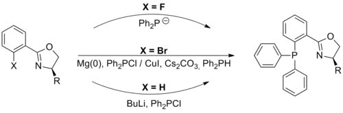 - 2-Bromoaryl oxazolines can be converted into a Grignard reagent, which react with chlorodiphenylphosphine.[4] Alternatively, the aryl bromide can be coupled with diphenylphosphine via a copper iodide-catalysed reaction.[5]