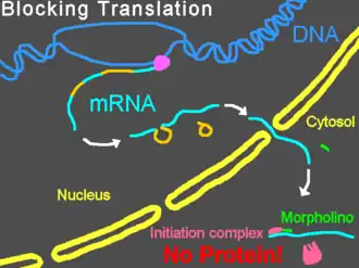 Morpholinos have been used to block miRNA activity[29][30] and maturation.[3] Fluorescein-tagged Morpholinos combined with fluorescein-specific antibodies can be used as probes for in-situ hybridization to miRNAs.[31] Morpholinos can block ribozyme activity.[32] U2 and U12 snRNP functions have been inhibited by Morpholinos.[33] Morpholinos targeted to "slippery" mRNA sequences within protein coding regions can induce translational frameshifts.[34] Morpholinos can block RNA editing,[35] poly(A) tailing[36] and translocation sequences.[37] Morpholino activities against this variety of targets suggest that Morpholinos can be used as a general-purpose tool for blocking interactions of proteins or nucleic acids with mRNA.