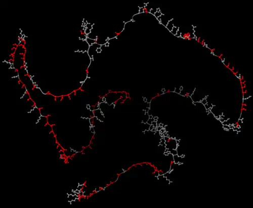 As the most phosphorylated natural protein, phosvitin contains 123 phosphoserine residues accounting for 56.7% of its total 217 amino acid residues.[3][8] The structure of phosvitin at large consists of 4-12 base pair stretches of serines, interspersed with amino acid residues lysine (6.9%), histidine (6.0%), and arginine (5.1%), among others in smaller quantities.[9] Phosvitin’s structure (right) is adapted from the protein vitellogenin (Gene: VTG2; Uniprot: P02845; residues 1-1850) generated by AlphaFold, where all the possible phosphorylated serine residues are highlighted in red. Phosvitin is one of four proteins cleaved from vitellogenin and is unstructured at neutral pH.[3] Despite phosvitin only accounting for 16% of total proteins in egg yolk, it alone accounts for 60% of the total yolk phosphoproteins as well as 90% of the total yolk phosphorus.[10][8]