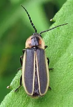 P. indictus is a small to medium-sized beetle, with adults approximately 6–10 mm (0.2–0.4 in) long. The head shield, or pronotum, is pale yellow with a thick, black, rectangular central mark with red or pink on both sides. The wing covers, or elytra, are dark with wide, well-defined, light-colored margins. Unlike fireflies that produce light as adults, P. indictus has no lanterns on its abdomen. The female is often slightly larger than the male.[2]
