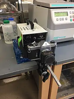 - The PCR tube is placed in a glass vial to hold it still inside the bellows of the camera that would irradiate the mixture. Upon closing the lid that covers the camera, pressing down the camera shutter illuminates the tube for however long you program the camera to irradiate for. Using the same camera for every replicate of the experiment ensures that the irradiation time and the distance from the light sourced is controlled for every PICUP experiment.[6]