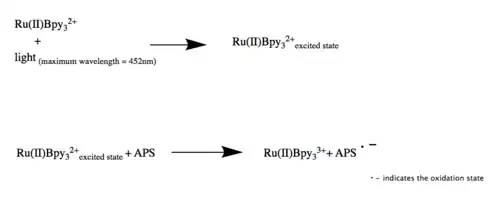 The unpaired single electron on the side chain reacts with another amino acid side chain of a polypeptide in the vicinity, resulting in a dimer with a covalent bond.[4] With the regeneration of Ru2+ when Ru3+ picks up an electron from the amino acids allows for continuous formation of radicals with Ru3+ being oxidized by APS.[2]