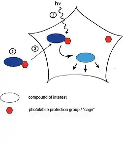 Photoactivatable probes, or caged probes, are cellular players (proteins, nucleic acids, small molecules) that can be triggered by a flash of light. They are used in biological research to study processes in cells. The basic principle is to bring a photoactivatable agent (e.g. a small molecule modified with a light-responsive group: proteins tagged with an artificial photoreceptor protein) to cells, tissues or even living animals and specifically control its activity by illumination.[1]