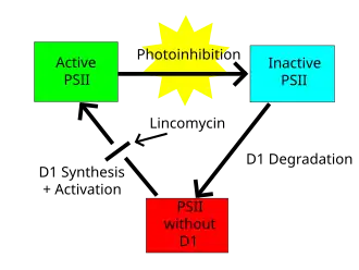 In photoinhibition studies, repair is often stopped by applying an antibiotic (lincomycin or chloramphenicol) to plants or cyanobacteria, which blocks protein synthesis in the chloroplast. Protein synthesis occurs only in an intact sample, so lincomycin is not needed when photoinhibition is measured from isolated membranes.[27] The repair cycle of PSII recirculates other subunits of PSII (except for the D1 protein) from the inhibited unit to the repaired one.