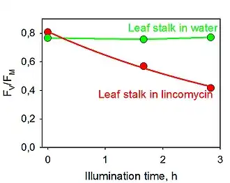- ^ a b Tyystjärvi, E & Aro, E-M (1996). "The rate constant of photoinhibition, measured in lincomycin-treated leaves, is directly proportional to light intensity". Proceedings of the National Academy of Sciences of the USA. 93 (5): 2213–2218. Bibcode:1996PNAS...93.2213T. doi:10.1073/pnas.93.5.2213. PMC 39937. PMID 11607639.