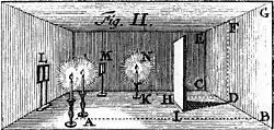 Lambert's book is fundamentally experimental. The forty experiments described in Photometria were conducted by Lambert between 1755 and 1760, after he decided to write a treatise on light measurement. His interest in acquiring experimental data spanned several fields: optics, thermometry, pyrometry, hydrometry, and magnetics. This interest in experimental data and its analysis, so evident in Photometria, is also present in other articles and books Lambert produced.[9] For his optics work, extremely limited equipment sufficed: a few panes of glass, convex and concave lenses, mirrors, prisms, paper and cardboard, pigments, candles, and the means to measure distances and angles.