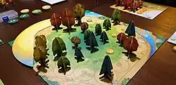 In the Life Cycle Phase,[2] the accumulated light is spent on growing trees, the cost of which is indicated on the associated spaces on the player board.[1] Paying the cost allows the player to move the object to the ready area of their game board, which indicates further costs to pay in order to move the object to the central game board.[1] A player may also cut down a large tree on the central board for a cost of 4 light to obtain a victory point token with a value dependent on its placement on the board.[2] Trees closer to the centre of the board earn a greater number of points.[4]