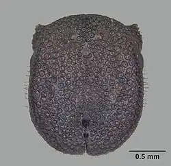 Examples of phragmosis are found in the order Anura (frogs and toads). Some species, such as Pternohyla fodiens and Corythomantis greeningi, have evolved a peculiarly casqued head adapted to protect the animal as it backs down a hole.[3] Another example is the head-plug defense used by the aphid Astegopteryx sp., in which a banana-bunch shaped gall consisting of several subgalls is used as a barrier.[4] Arguably, the most commonly observed phragmotic behaviour is within the ant family.[2] The behaviour is displayed in numerous taxa such as Camponotus, Colobostruma, Crematogaster, Pheidole, Blepharidatta, Cephalotes pusillus, Carebara elmenteitae, Stenamma expolitum, in which the soldiers have unusually large, disc-shaped heads, which are used to block nest entrances against intruders.[1]