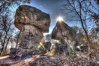 Part of the Ubol Ratana Dam reservoir is in the park's eastern section and is located by the park headquarters. The rock formations at Ham Tang have been eroded by wind and water into unusual shapes such as a mushroom-like pillar.[1][2]