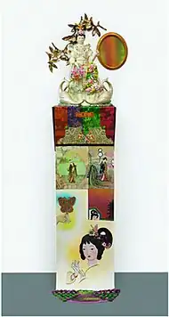 In the 2000s, Bramson increasingly realized the object-based qualities of her earlier bas relief paintings.[4] These more sculptural works incorporate assemblage and arrangements of found objects, with shelves and other elements projected off of walls, as in her "scroll works" first begun in 2006 (e.g., A Glimpse of Paradise, 2015). In the scroll pieces, she combines characteristic romantic imagery and allusions—painted on long, flowing sectioned sheets—with souvenir-like objects that suggest desires and memories assigned to and re-packaged into icons.[3] Together, the visual elements imply the unfolding and revealing of fantasies and histories of the eclectic cast of characters Bramson has borrowed from kitsch and other cultural sources.[50]
