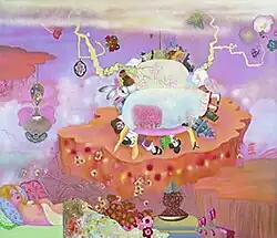 Phyllis Bramson (born 1941) is an American artist, based in Chicago and known for "richly ornamental, excessive and decadent" paintings[1] described as walking a tightrope between "edginess and eroticism."[2] She combines eclectic influences, such as kitsch culture, Rococo art and Orientalism, in juxtapositions of fantastical figures, decorative patterns and objects, and pastoral landscapes that affirm the pleasures and follies of romantic desire, imagination and looking.[3][4][5][6] Bramson shares tendencies with the Chicago Imagists and broader Chicago tradition of surreal representation in her use of expressionist figuration, vernacular culture, bright color, and sexual imagery.[1][7] Curator Lynne Warren wrote of her 30-year retrospective at the Chicago Cultural Center, "Bramson passionately paints from her center, so uniquely shaped in her formative years […] her lovely colors, fluttery, vignette compositions, and flowery and cartoony imagery create works that are really like no one else's.[4] Writer Miranda McClintic said that Bramson's works "incorporate the passionate complexity of eastern mythology, the sexual innuendos of soap operas and sometimes the happy endings of cartoons."[8]