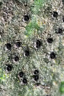The lichen has a smooth, thin, and inconspicuous thallus that is brownish green or pale greyish green in colour (sometimes tinged with pink). It is up to 5 mm across (usually much less) and about 15–25 μm thick. The photobiont partner is a green alga that is rounded and measures 5–10 μm in diameter; intermixed with fungal hyphae, they can be aggregated in irregular clumps or plates. The fruiting structures, the perithecia, are initially hemispherical but later develop a depression at the top of the structure that makes them appear wart-shaped. Measuring 0.1–0.15 mm in diameter and about 0.1 mm high, they are pinkish brown to almost black. The ascospores, which measure eight per ascus, have a fusiform to ellipsoid shape and have three septa, and typically measure 14–16 by 4.5–5 μm.[2] Specimens collected in Spain have a single septum, but have otherwise identical morphology with specimens found elsewhere.[3]