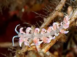 This monophyletic clade of mollusks were prosobranchs that eventually rid themselves of an exoskeleton.[7][8] Elongated metazoans will lengthen themselves out to about 50 mm at longest.[9] P. poindimiei typically has two pairs of tentacles with a built in olfactory system containing an eye at each base. The soft shell-less slug has cerata outgrowths on its upper side filled with the organism’s respiratory and digestive systems and can be cast off for protective purposes.[4] These cylindrical gill cavities typically have two main defenses resulting from nematocyst or zooxanthellae obtainment.[3] These translucent cerata for most Phyllodesmium contain cnidosacs at the tips in which nudibranchs digest nematocysts from Cnidarian prey, such as jellyfish or corals.[10] P. poindimiei lack these cnidosacs that could be used for its own defense against the swimming crab Thalamita integer.[4] Another modification this species lacks is the ability to accumulate zooxanthellae, microscopic photosynthetic dinoflagellates, in the branched digestive tract.[11] The non-symbiotic species such as P. poindimiei were thought to have evolved earlier than the symbiotic clades.[7]
