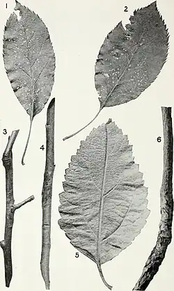 | Apple Leaves and Twigs Showing Blotch. 1 and 2, Leaves of the Arkansas Black variety, with spots caused by the blotch fungus; 3, 1-year-old blotch canker on Ben Davis apple twig; 4, 2-year-old blotch canker on Ben Davis apple twig; 5, leaf of the Missouri variety, showing lesions on petiole and midrib produced by artificial inoculation with spores of Phyllosticta solitaria from pure cultures; 6, an older blotch canker on a Ben Davis twig | |
